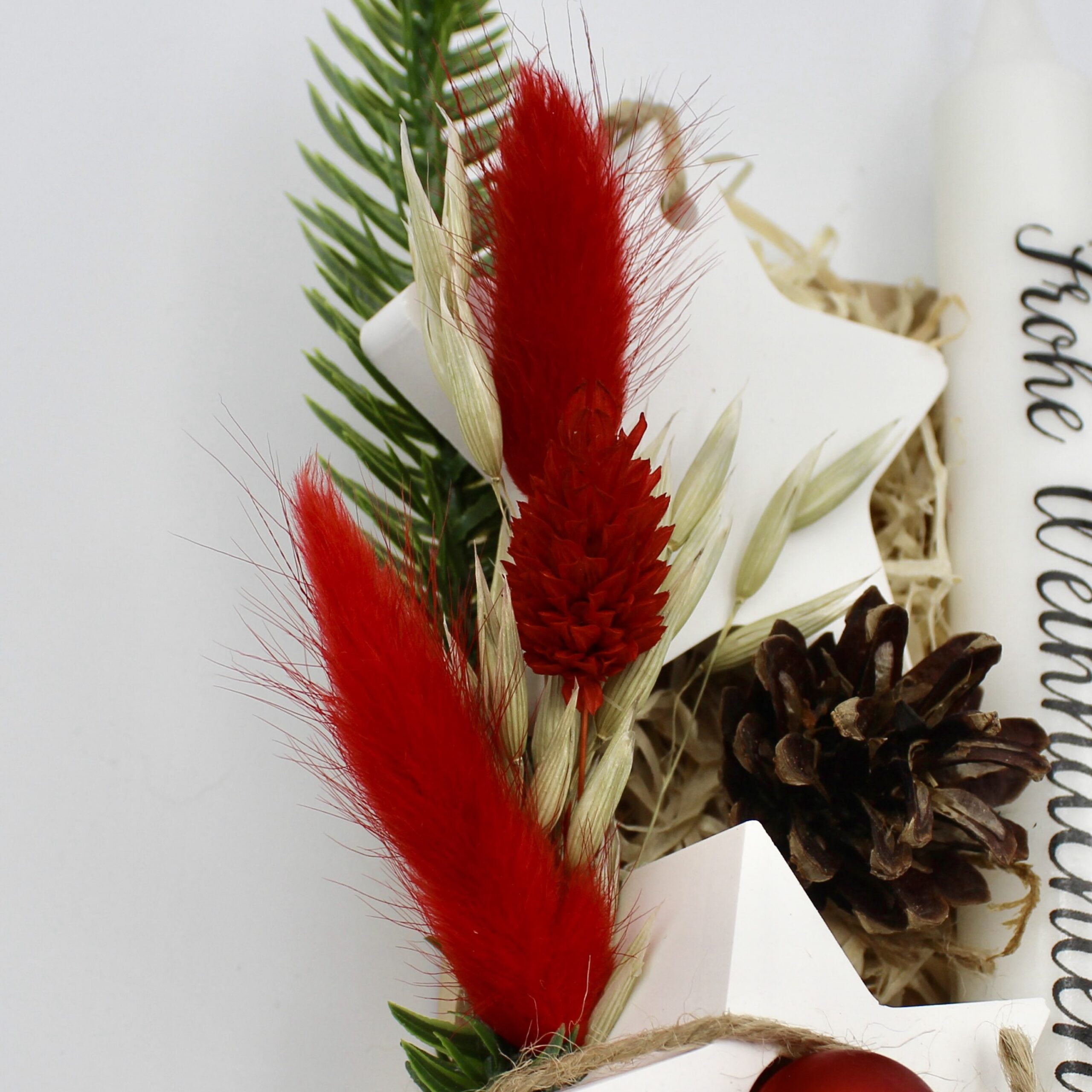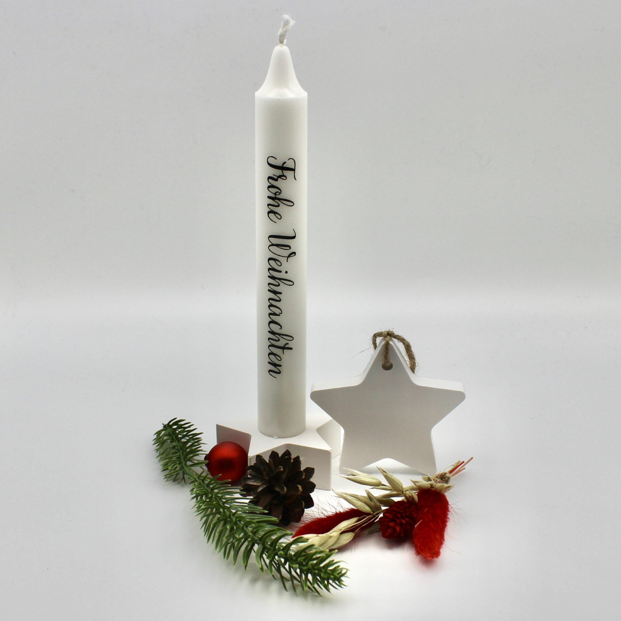 Unabhängig von der gewählten Aufschrift verströmt die Kerze mit ihrem sanften Schein eine beruhigende Wärme und verspricht eine Brenndauer von etwa 6 Stunden. Sie erschafft mit ihrem festlichen Licht eine behagliche, weihnachtliche Atmosphäre, die zum Entspannen einlädt und die besinnliche Stimmung der Weihnachtszeit unterstreicht.